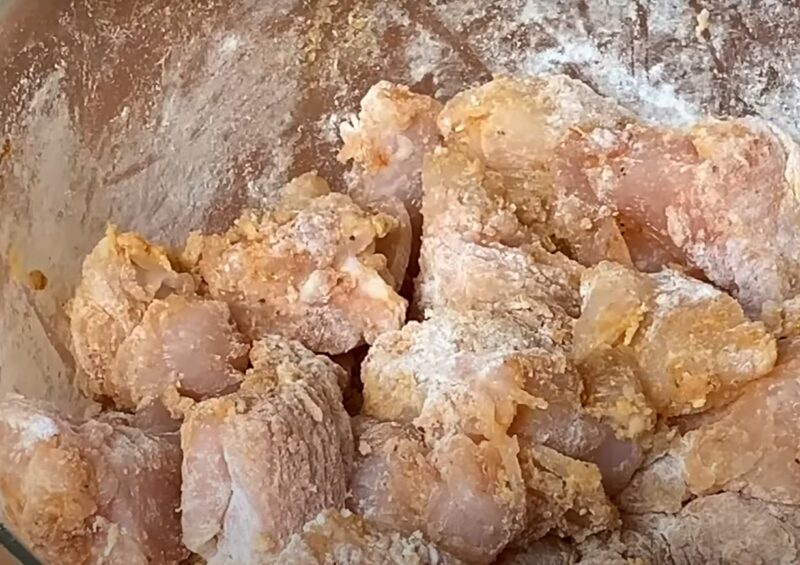 Нарізаємо куряче філе на невеликі кубики, солимо і перчимо, висипаємо паприку та перемішуємо. Висипаємо до курячого філе борошно, знову змішуємо компоненти.