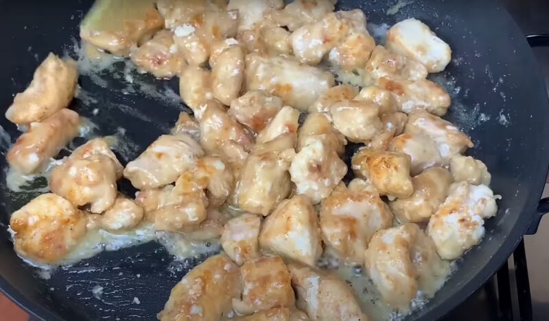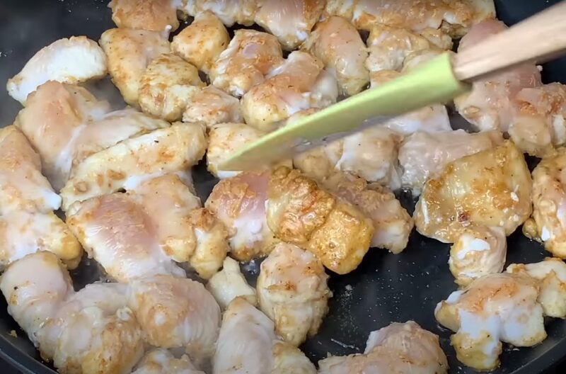 У сковороді на олії обсмажуємо шматочки курки з усіх боків.