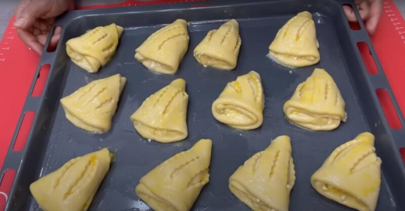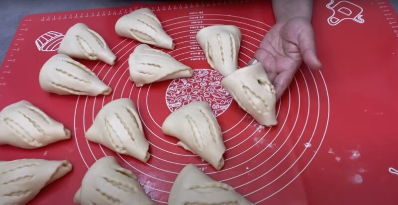 На другому кутку потрібно зробити 4 невеликі паралельні надрізи. Загортаємо начинку в тісто трикутником.