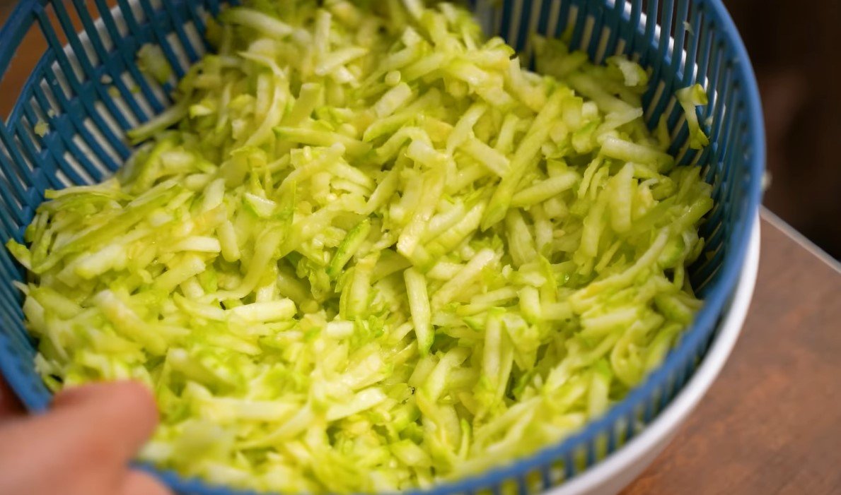 Промиті кабачки натираємо на тертці. Додаємо чайну ложку солі, перемішуємо і залишаємо на 15 хвилин, щоб вони пустили сік. У цей час займаємося начинкою.