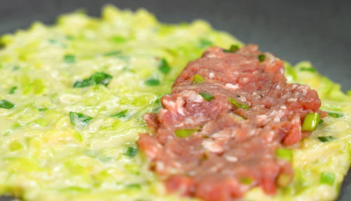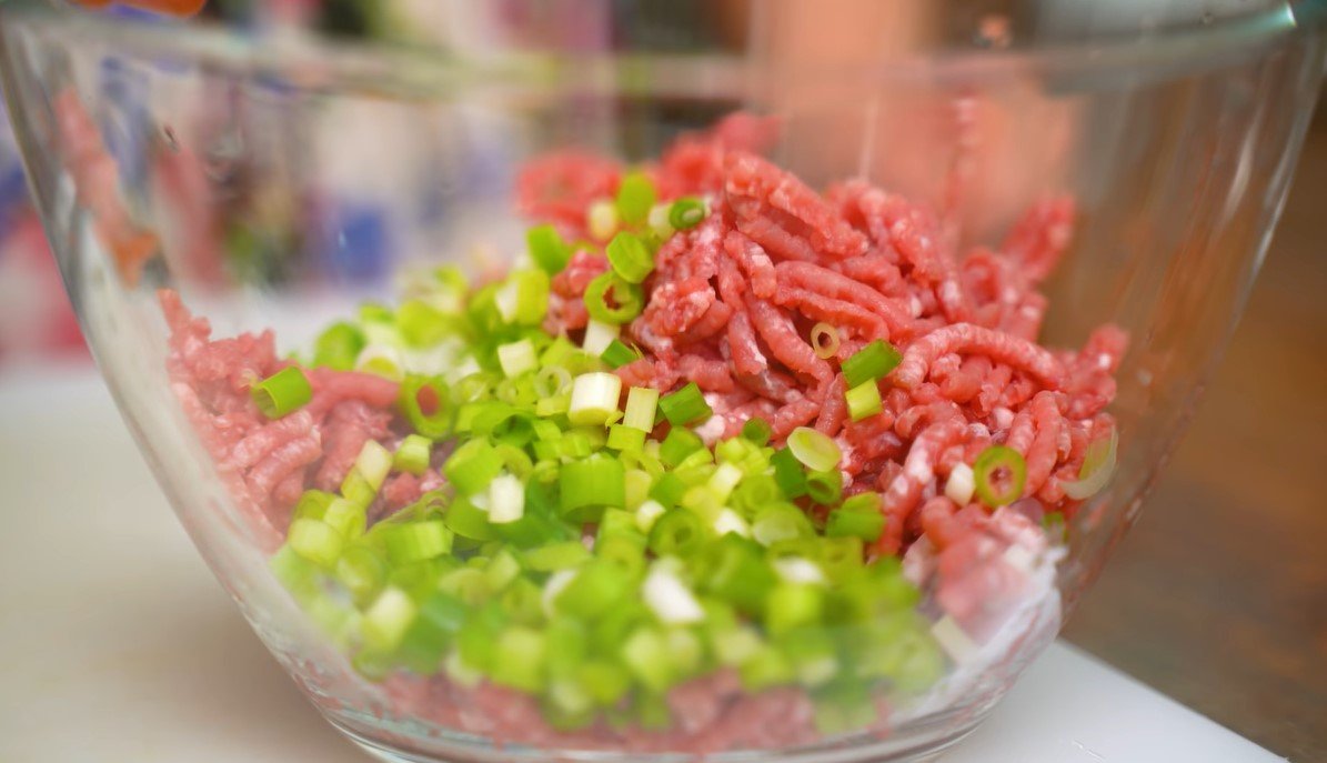 Якщо робите фарш самостійно, додайте для соковитості 50 грамів води. Якщо фарш покупний, вода непотрібна. Солимо і перчимо за смаком м’ясо, подрібнюємо білу частину зеленої цибулі, додаємо до фаршу.