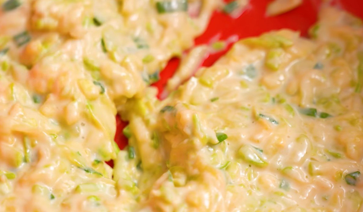 Кабачки вже пустили сік, віджимаємо їх, перекладаємо у глибоку тарілку. Додаємо яйце, молоко, подрібнені стеблі зеленої цибулі, підсолюємо третиною чайної ложки солі. Поступово вводимо борошно.