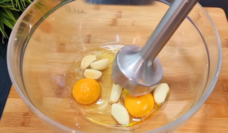 З’єднайте яйця та часник і за допомогою занурювального блендера перетворіть їх на однорідну масу.