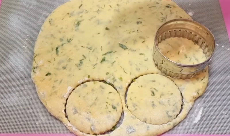 Присипте тісто борошном і розкотіть у коржик товщиною приблизно 0,7 см. Виріжте з тіста круглі заготовки.