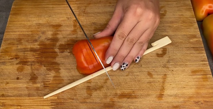 1. Болгарський перець розрізаємо вздовж навпіл і видаляємо плодоніжки і все насіння. Робимо надрізи на перці, обмежувачем нам буде служити паличка від ролів.