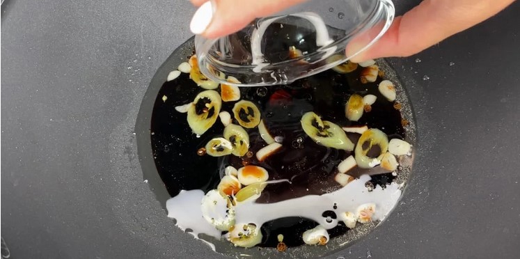 6. Потім вливаємо 100 мл. соєвого соусу, 30 мл. оцту 9%, додаємо 50 гр. цукру. Перемішуємо і тримаємо на вогні протягом однієї хвилини. Потім включаємо газ і даємо маринаду охолонути.