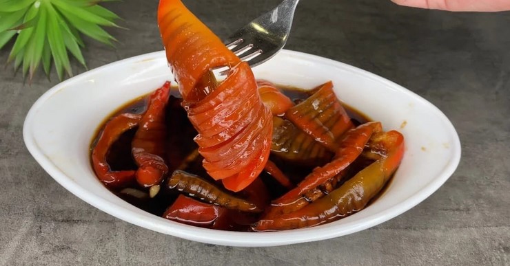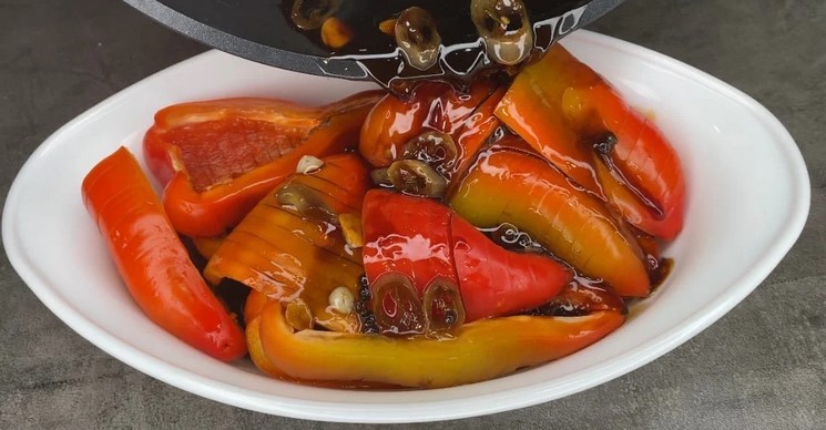7. Беремо глибоку тарілку і намагаємося викласти перець щільно один до одного. Заливаємо остиглим маринадом і даємо промаринуватися добу.