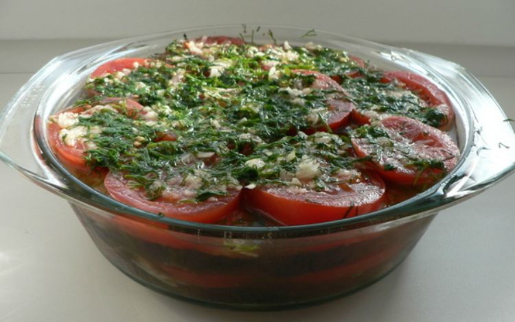 Приготування: юаклажани провари в кип’ятку хвилин 8, остуди, наріж кружечками і обсмажити на олії. Уклади у велику каструлю, посип сумішшю подрібненого часнику і зелені. Перець розріж на чотири частини, обсмаж до м’якості, відправ в каструлю до баклажанів і теж посип часником і зеленню. Нарізані кружечками помідори виклади третім шаром і присипаючи часниковою посипкою. Змішай для маринаду оцет, воду, цукор і сіль, залий овочі в каструлі. Постав в холодильник на ніч.