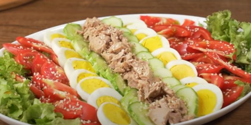 7. Зливаємо рідину з тунця і розминаємо виделкою. Розкладаємо на салаті.