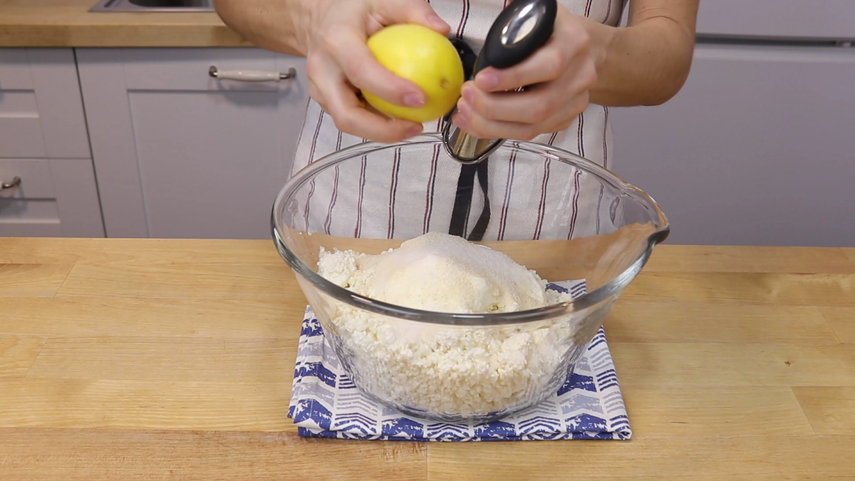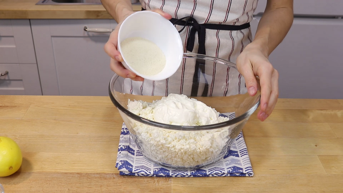 У великій мисці з’єдную сир, сметану, манку, сіль, ванільний цукор.