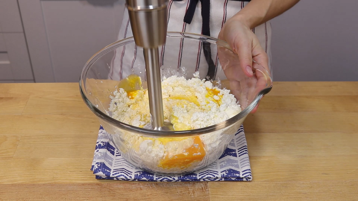Білки відокремлюю від жовтків. Жовтки кладу до сиру. Сир із усіма інгредієнтами змішую занурювальним блендером.