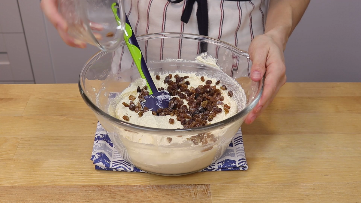 До родзинок додаю трохи борошна, перемішую, і підмішую до сиру. Родзинки попередньо потрібно промити.