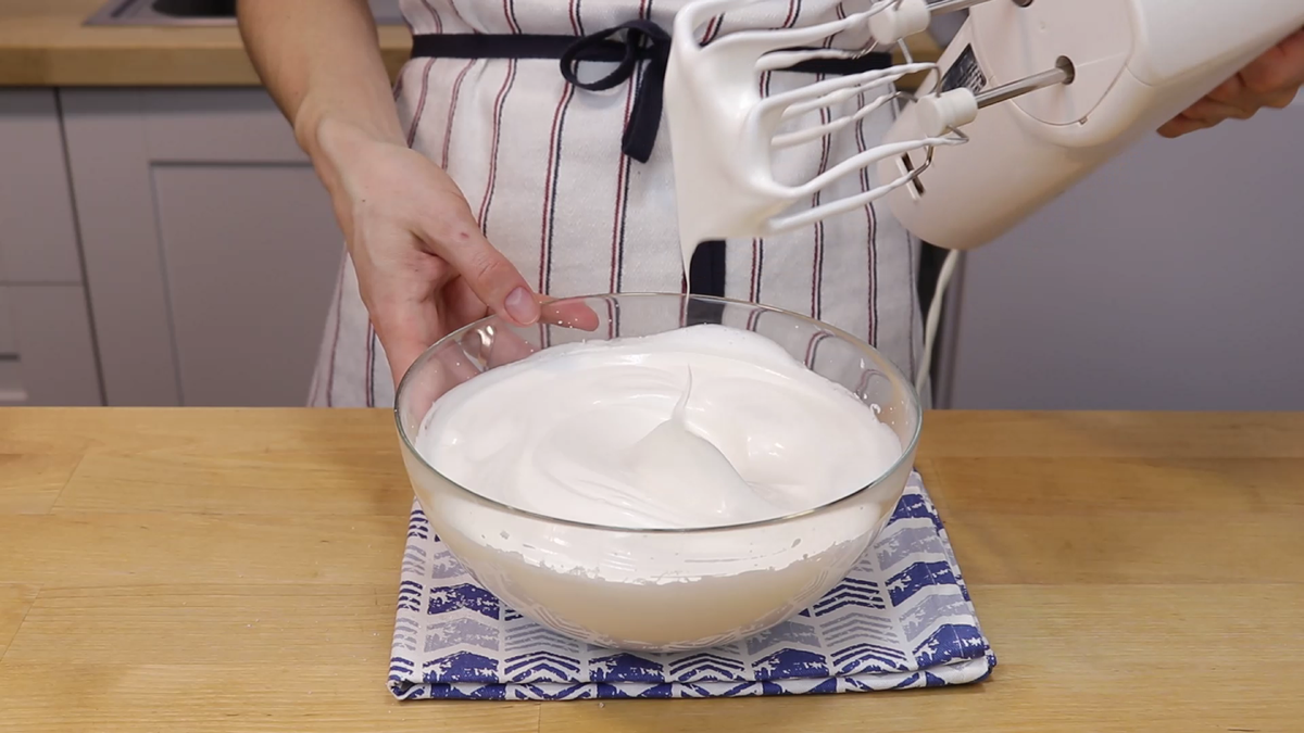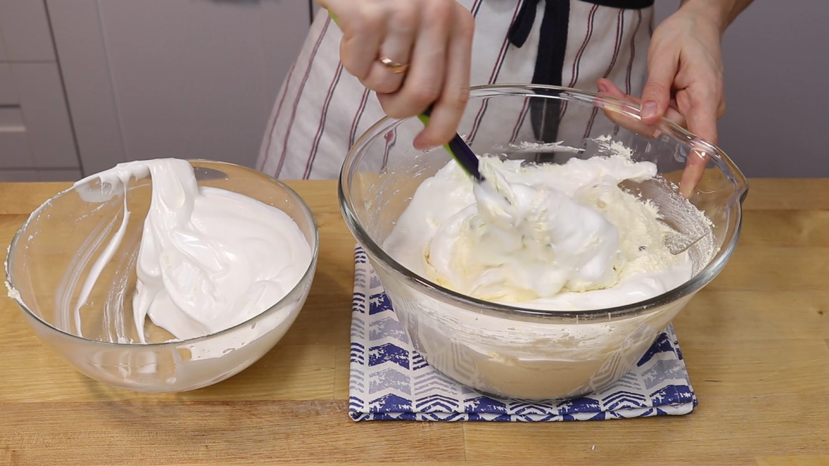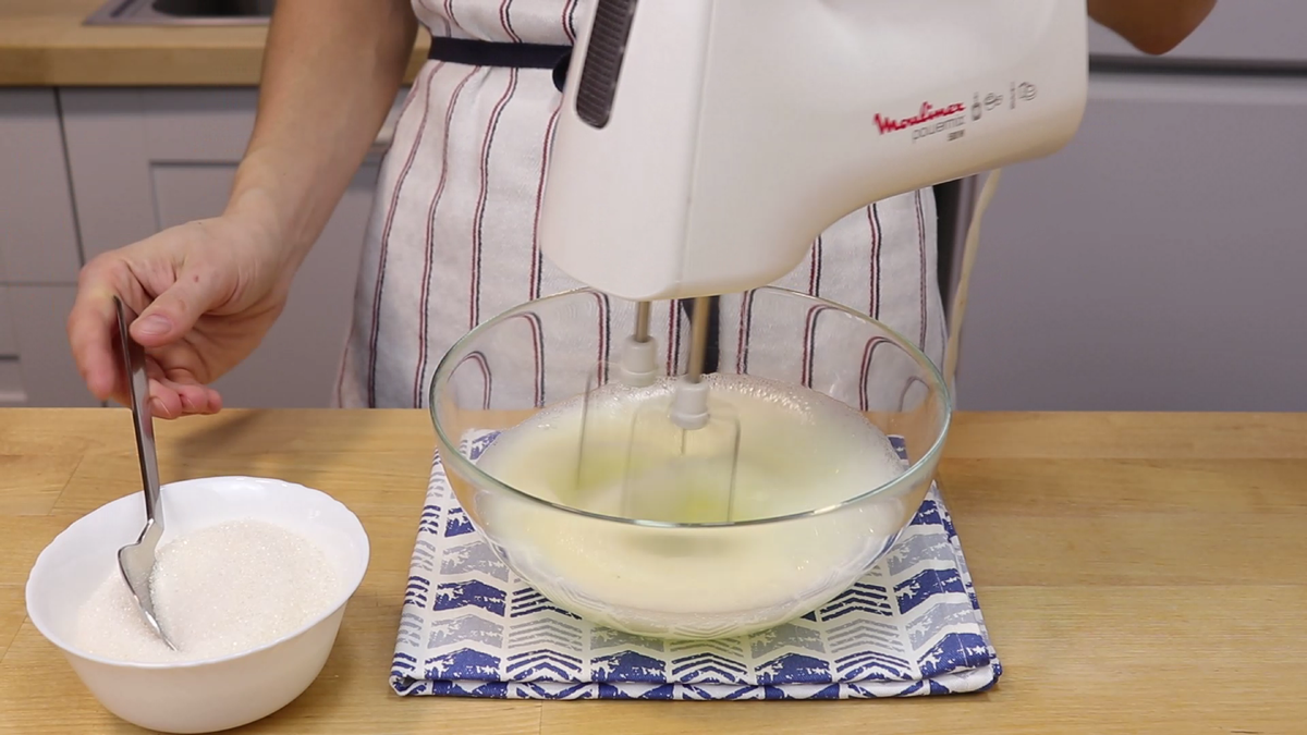 Готову масу поки що відкладаю убік, щоб манка набрякла. Збиваю білки потроху підсипаючи цукор.