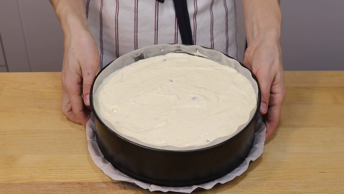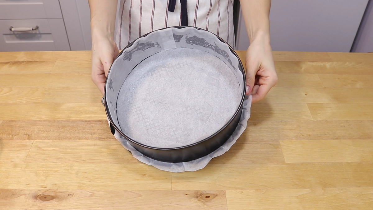 Форма для випікання діаметром 24 см, дно я застелила пергаментним папером. Бортики змастила маслом і застелила пергаментом.