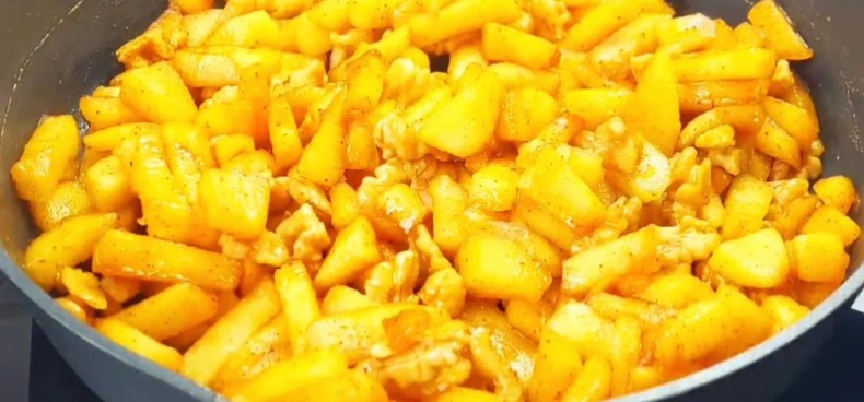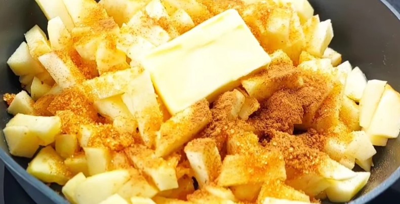 Викладаємо на суху сковороду та поливаємо лимонним соком. Додаємо цукровий пісок, мелену корицю та зверху кладемо шматочок вершкового масла.