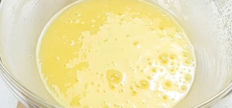 У чисту тарілку вливаємо яйце, засипаємо цукровий пісок, ванільний цукор, сіль і розмішуємо. Наливаємо олію і розмішуємо.