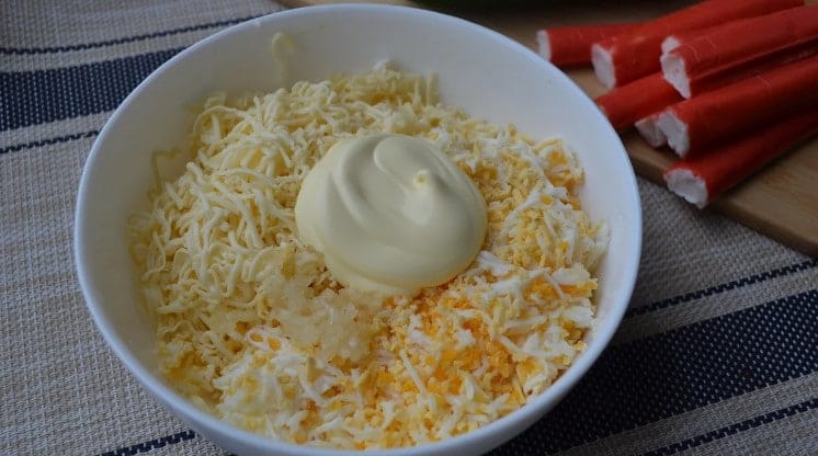 Отже, в першу чергу необхідно натерти на дрібній тертці плавлені сирки (сирки намагаюся купувати найкращої якості, правда ціна на них кусається) і яйця, які я відварила заздалегідь до крутого стану. Додати видавлений через прес часник, покласти майонез або сметану, не забути трохи посолити, зовсім чуть чуть і добре перемішати.