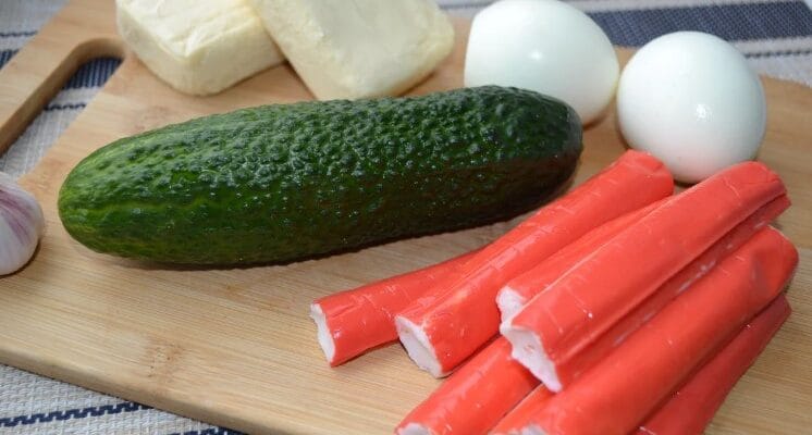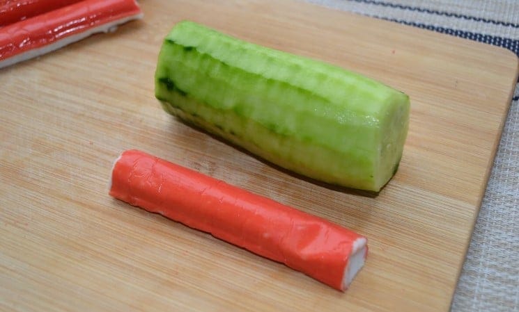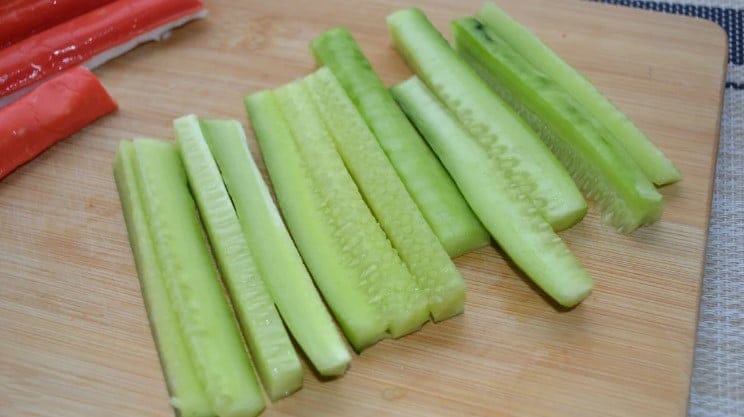 Тепер прийшов час огірка. Його потрібно почистити від шкірки і відрізати по довжині крабової палички.
