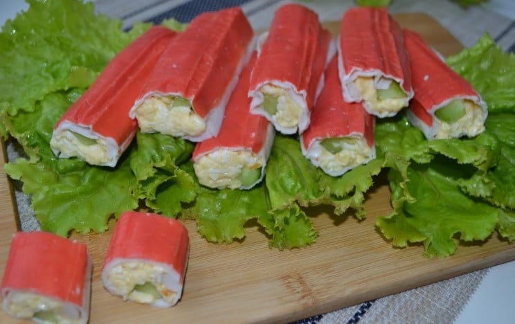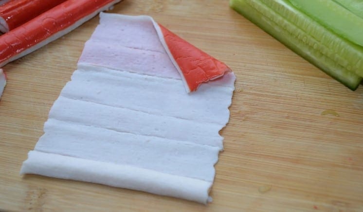 Далі крабову паличку необхідно акуратно розгорнути. Якщо у Вас цього не вдається зробити не варто переживати, досить крабову паличку покласти на 30 секунд в гарячу воду, просушити паперовим рушником, і все обов’язково вийде.