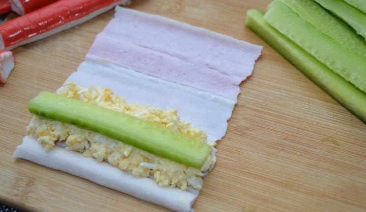 Тепер на край де паличка абсолютно біла необхідно викласти начинку з плавлених сирків і яєць (близько 1 столової ложки), зверху покласти огірочок і загорнути в рулетик.