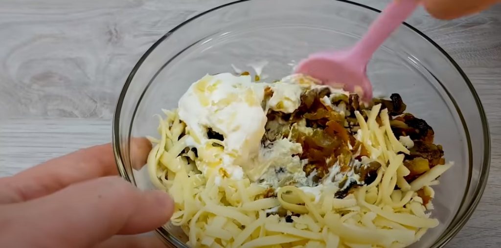 Одну змішуємо з овочами і грибами, додаємо ще сметану і часнику подрібненого, вимішуємо масу до однорідності.