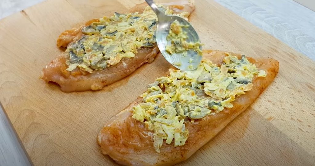 Кожне філе розрізаємо на два шматки і добре відбиваємо, заправляємо сіллю і перцем, паприкою і іншими спеціями, втираємо всі спеції в м’ясо і залишаємо маринуватися на 20 – 30 хвилин.