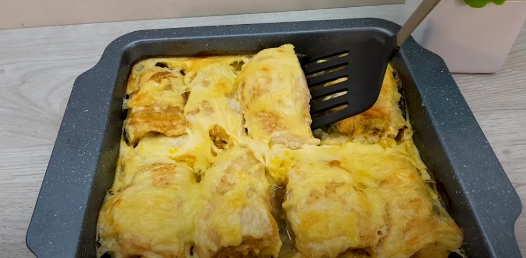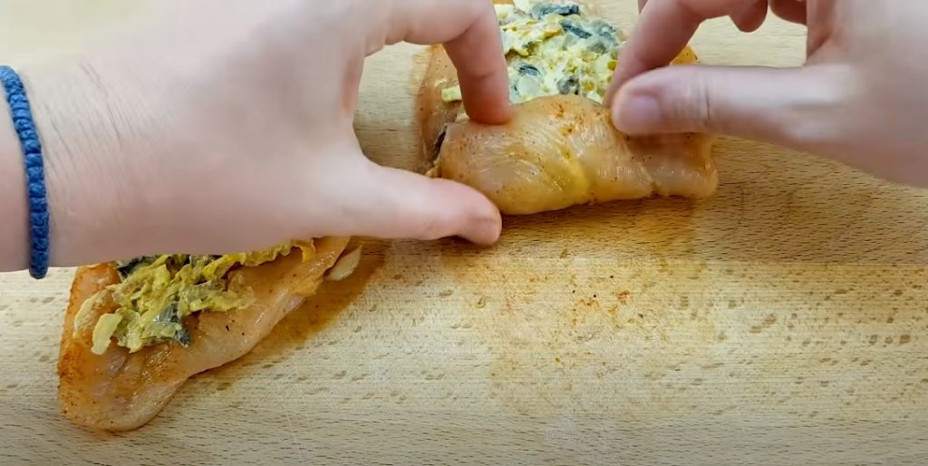 Викладаємо цю начинку на кожне відбите філе, звертаємо рулет і при необхідності, фіксуємо його шпажкою.