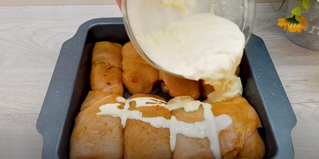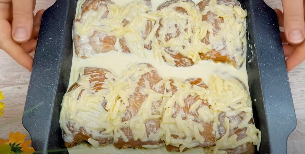 Яйце збиваємо зі сметаною (пару ложок) і сіллю, тертим сиром і викладаємо соус на рулети.