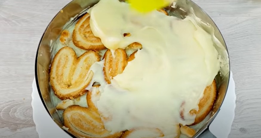Викладаємо у форму шар печива і добре змащуємо кремом, потім наступний шар і крем.