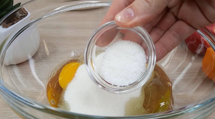 1. Розбити в глибоку тарілку яйця, додати цукор та ванільний цукор. Добре перемішати, щоб маса побіліла.