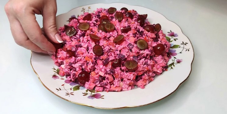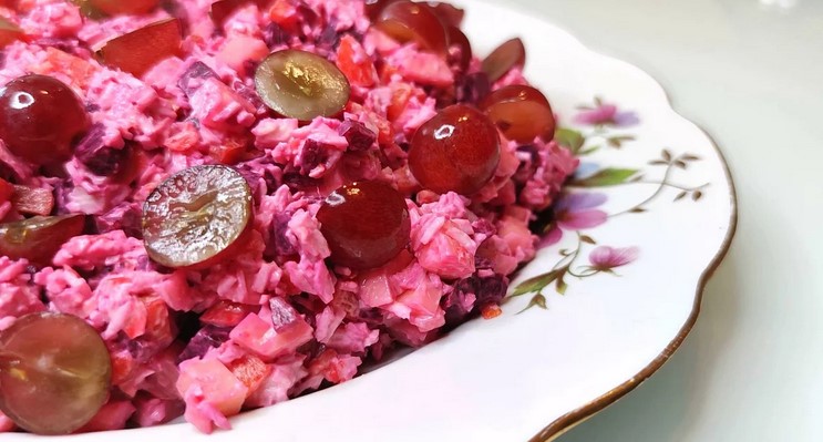 Салат заправляю майонезом. За бажанням його можна прикрасити половинками винограду. Салат прекрасний за смаком, як з виноградом, так і без нього.