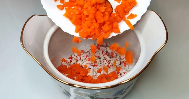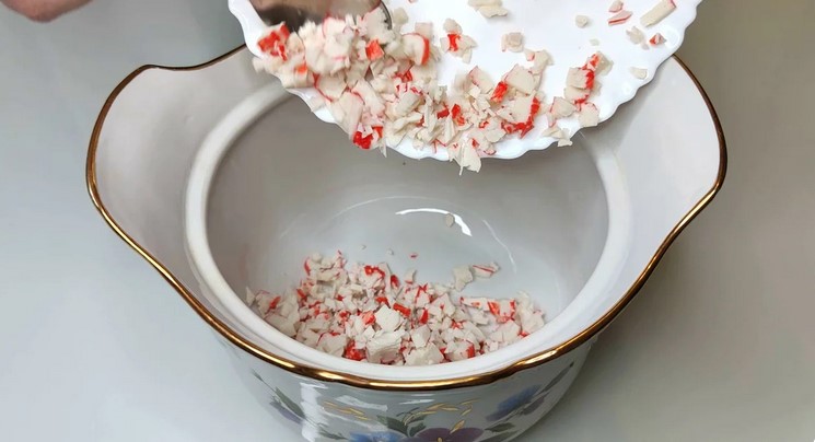 Перед тим, як покласти мені його в тарілку тітка сказала: «ніколи не вгадаєш склад». Коли я спробувала салат відразу визначилася – основа салату підкопчена форель! Яке було моє здивування, коли виявилося, що замість дорогої форелі в салат були додані звичайнісінькі крабові палички.