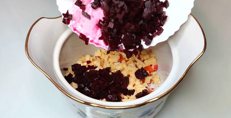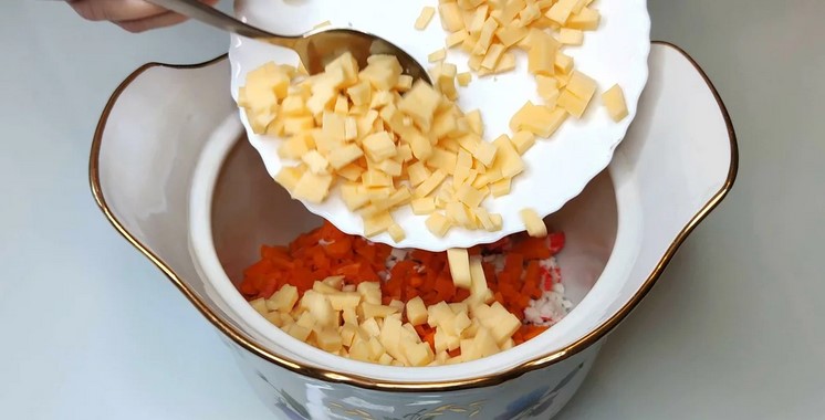 3. Слідом висипаю до них твердий сир. Всі інгредієнти ріжу дрібними кубиками.