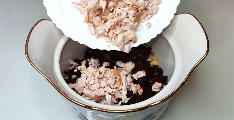 5. І в завершенні в салат відправляється копчена куряча грудка. Так Так! У цьому салаті прекрасно уживаються крабові палички і курка. Морський «аромат» крабових паличок в тандемі з «копченою» курячою грудки створюють в салаті абсолютне відчуття присутності дорогої якісної риби.