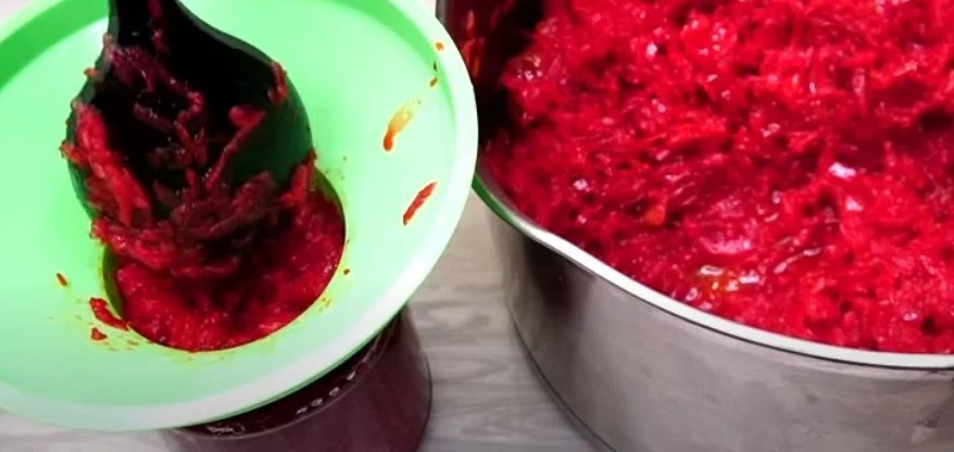 Моркву та буряки тремо на великій тертці, цибулю ріжемо в довільному порядку.