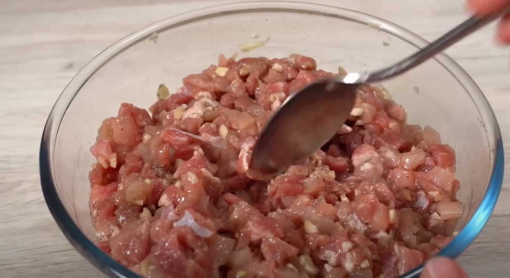 Всі види м’яса дуже дрібно рубаємо ножем та змішуємо.