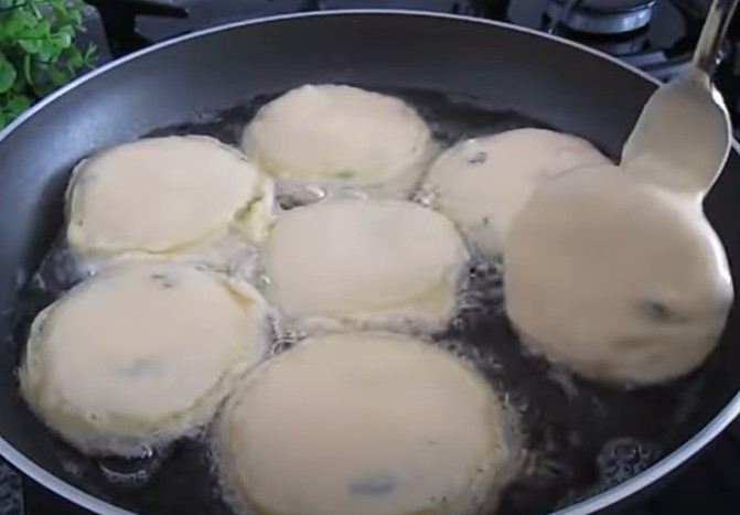 Занурюємо пиріжки в кляр і обсмажуємо в олії. Наливайте її досить.