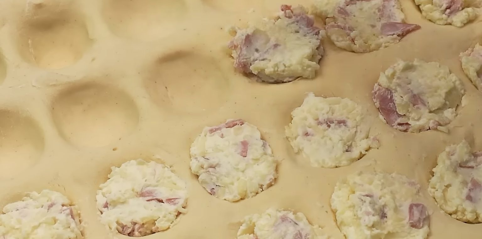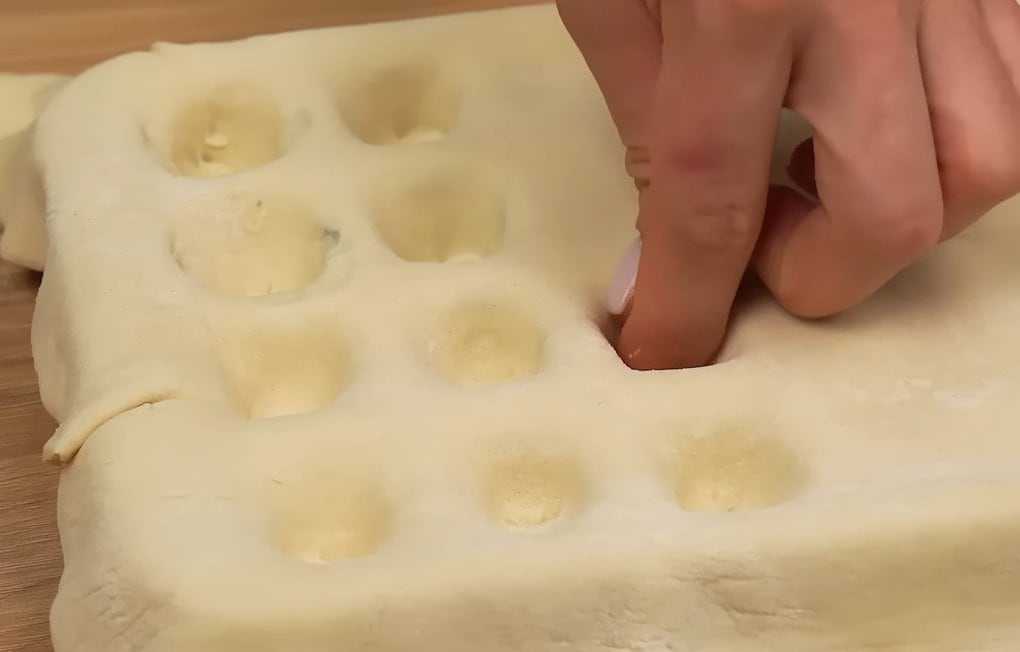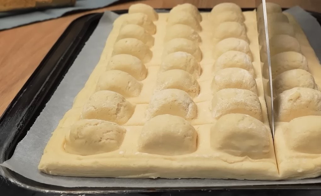 Присипте форму для льоду з досить великими комірками борошном. Зверху на форму викладіть лист листкового тіста і обережно розподіліть його по коміркам.