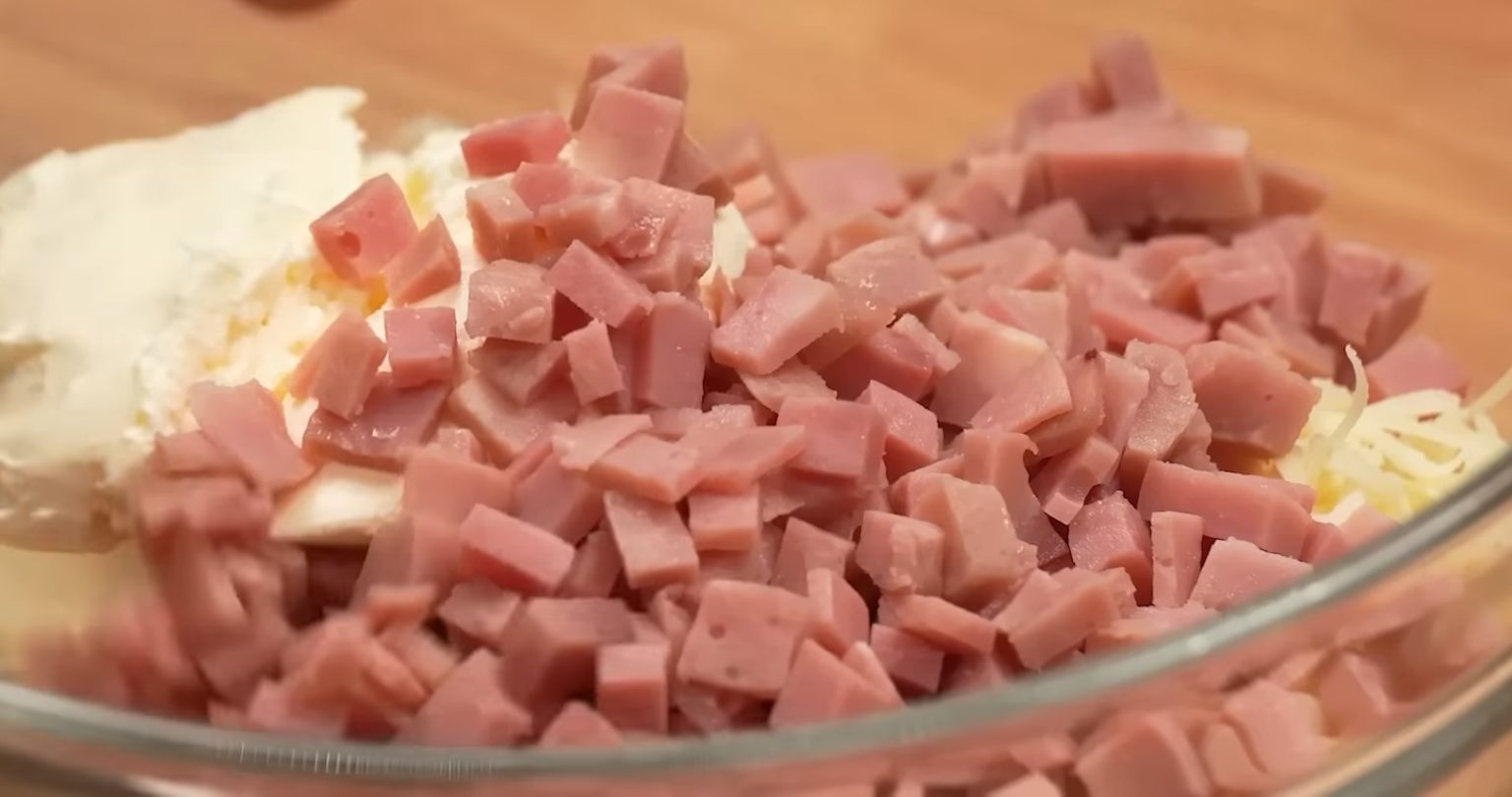 Для приготування начинки натріть сир на дрібній тертці і змішайте з вершковим сиром і нарізаною шинкою.