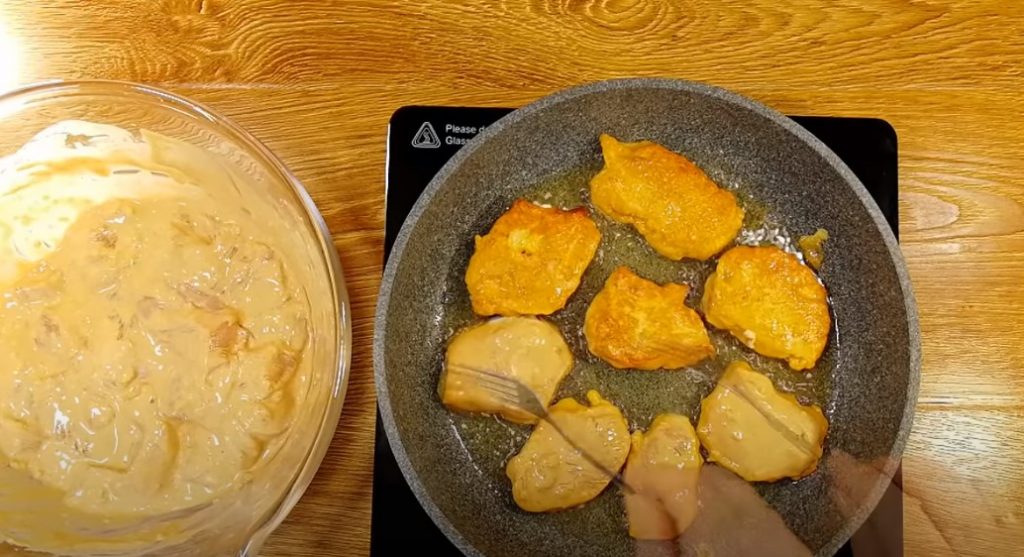 Розігріваємо олію і викладаємо по шматочку м’яса, намагаючись, щоб воно було повністю покрито кляром.
