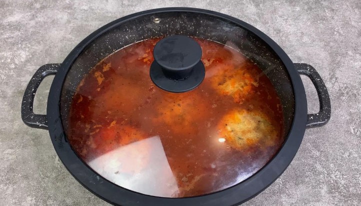 У сковороді змішуємо бульйон з томатною пастою, додаємо воду, солимо і перчимо на смак, додаємо трохи цукру, всі спеції та ароматні трави.