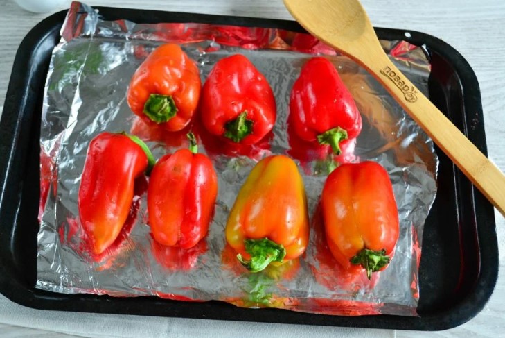 Деко застилаємо фольгою і розкладаємо в один шар перець.