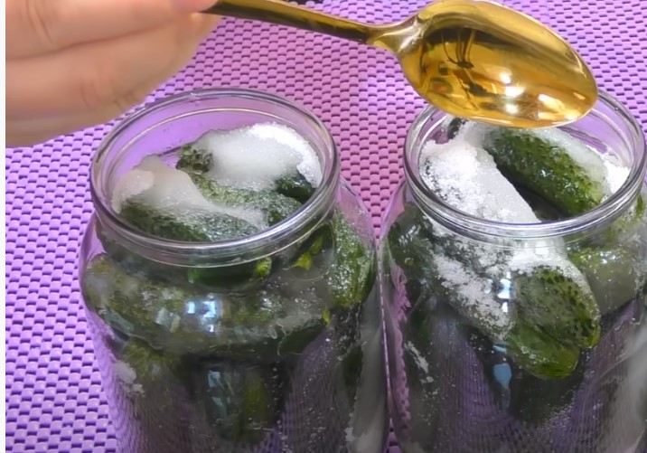 Засипаємо в банки сіль, цукор, вливаємо оцет – 3 столові ложки.