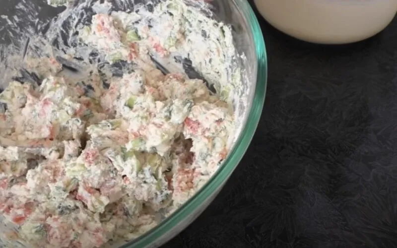 Залишаємо тісто під кришкою на 20 хвилин – настоюватися. У цей час для начинки треба забрати з огірка насіння, нарізати на дрібний кубик. Аналогічно нарізаємо рибу, шаткуємо дрібно кріп. Усі нарізані продукти викладаємо в миску із сиром, перемішуємо.