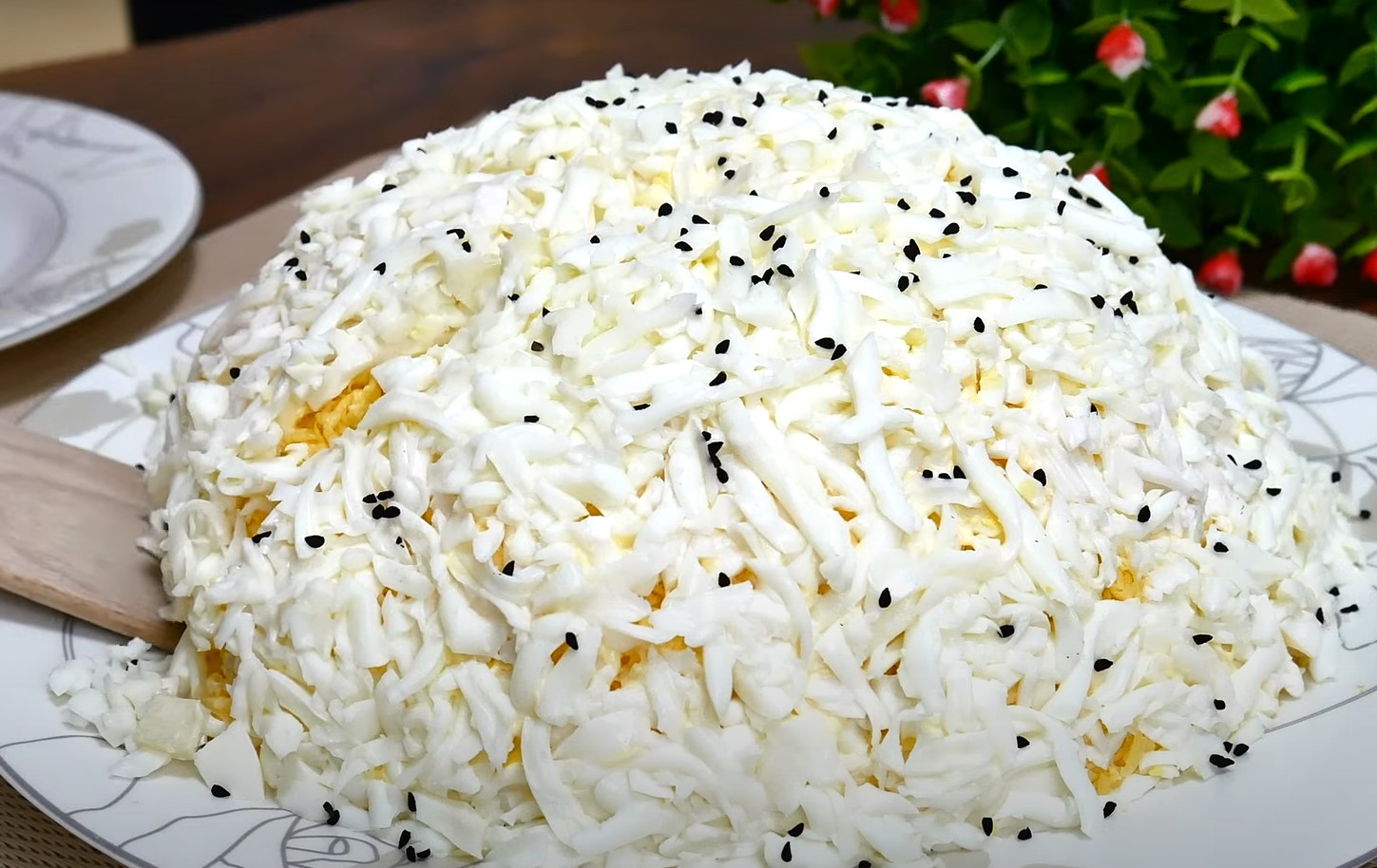 Майонезом наносимо візерунок. І посипаємо тертим яєчним білком. На завершення прикрашаємо кунжутом.