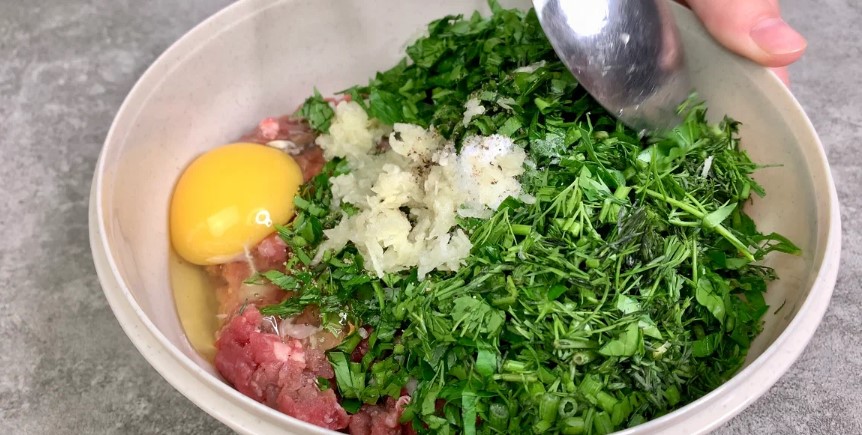 Фарш беріть будь-який на свій смак, заправляємо яйцем, сіллю, перцем, спеціями, рубаною зеленню, часником. Добре перемішуємо.