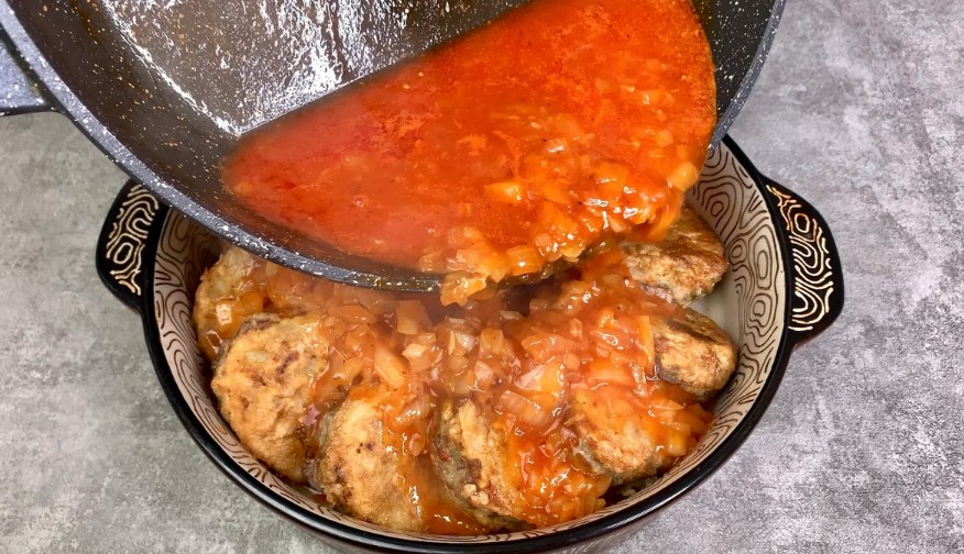 Для соусу обсмажуємо кубики цибулі до готовності, додаємо томатну пасту, сіль, цукор, спеції та вливаємо воду. Доводимо до кипіння та виливаємо у форму до картоплі.