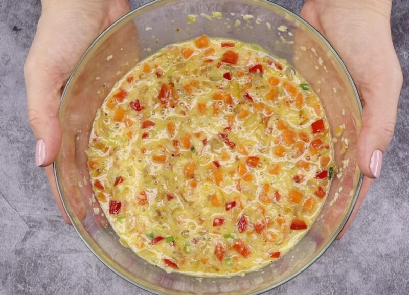 В окремій мисці з’єднуємо яйця з щіпкою солі та молоком, збиваємо до однорідності. Подрібнюємо на дрібній тертці сир, викладаємо разом із обсмаженими овочами в яєчну суміш.