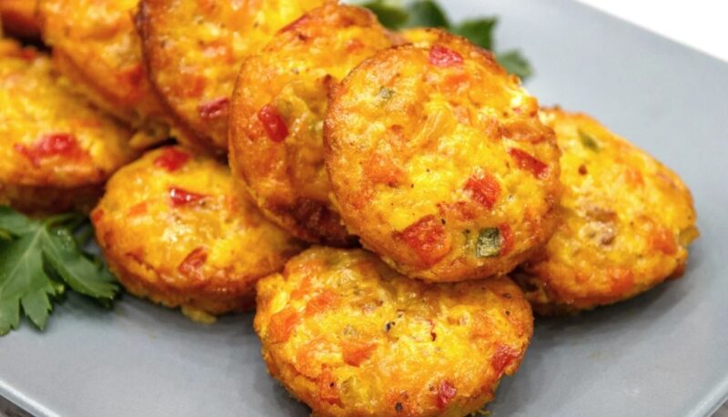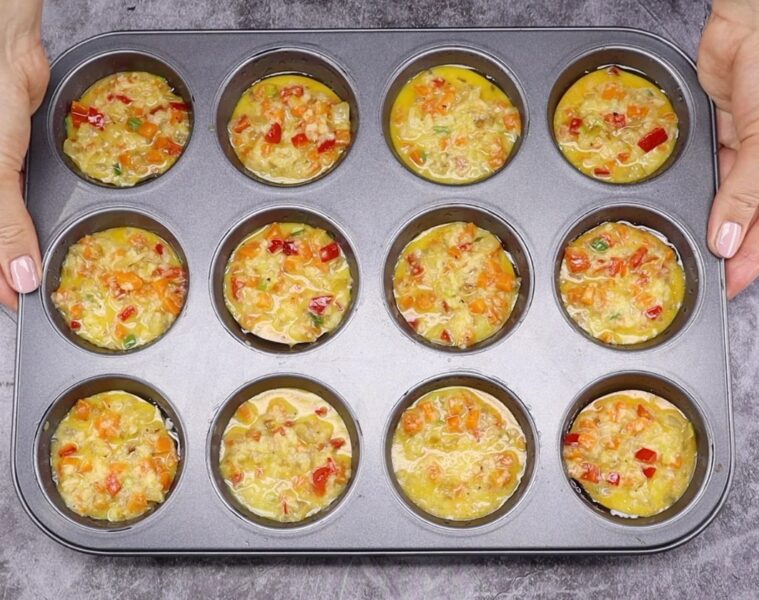 Змащуємо форми для маффінів олією, виливаємо в них змішану яєчну масу. Запікаємо страву протягом 15 хвилин у духовці при 200 градусах.